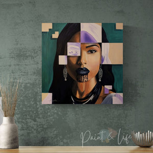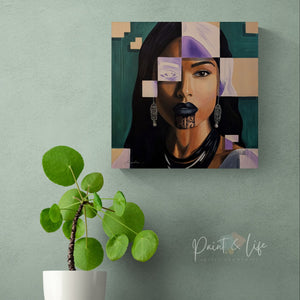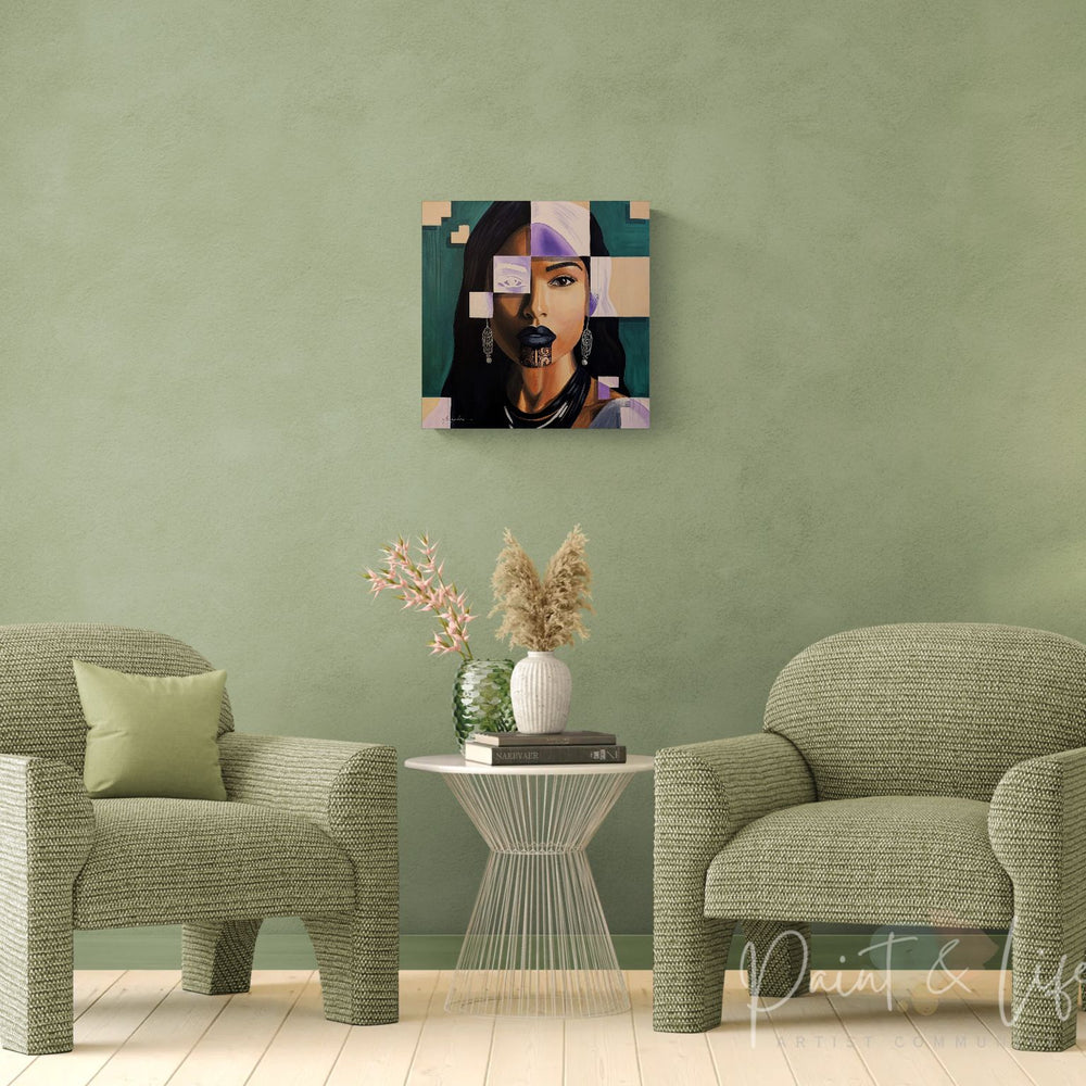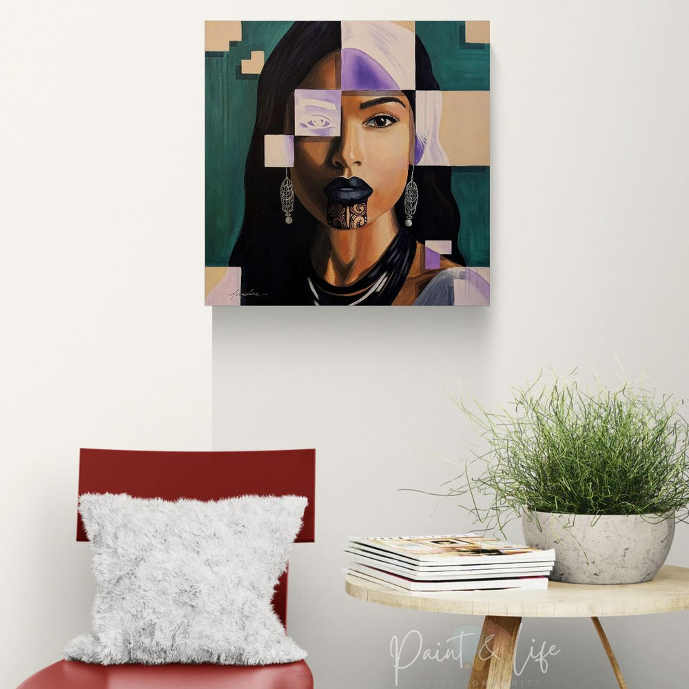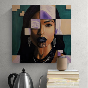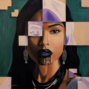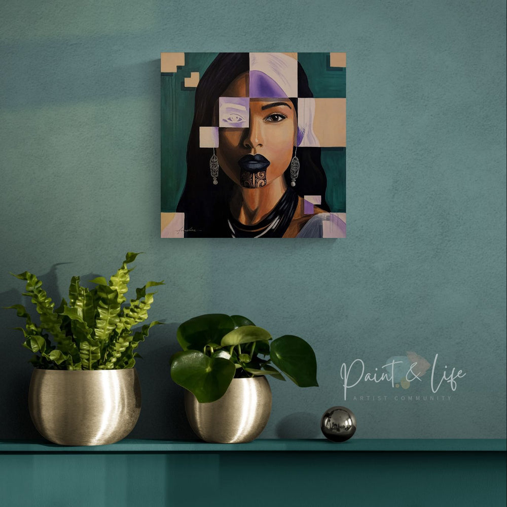 Tags:contemporary female portrait, contemporary figurative painting, contemporary realism and abstraction, cultural identity portrait art, fragmented portrait art, geometric portrait painting, Maori portrait painting, modern fine art portrait, Polynesian portrait art, symbolic portrait painting